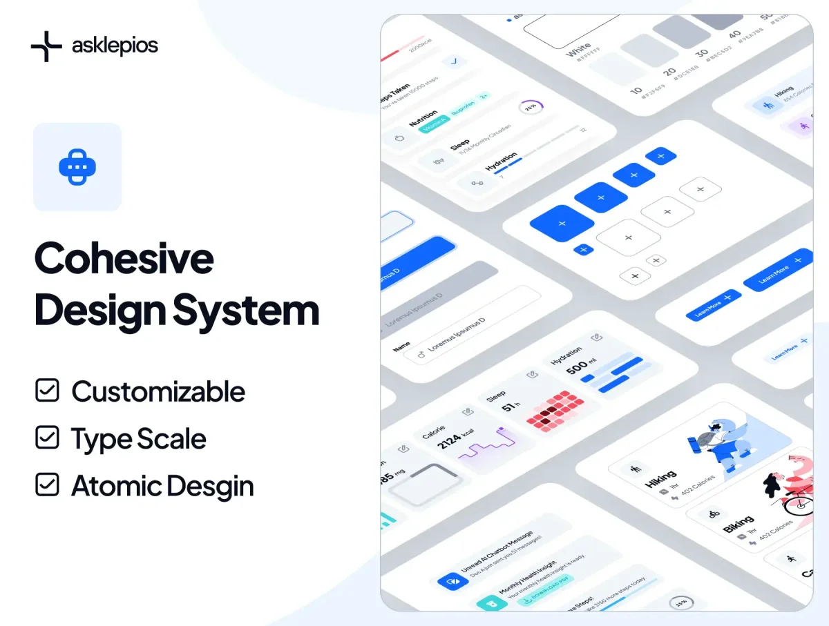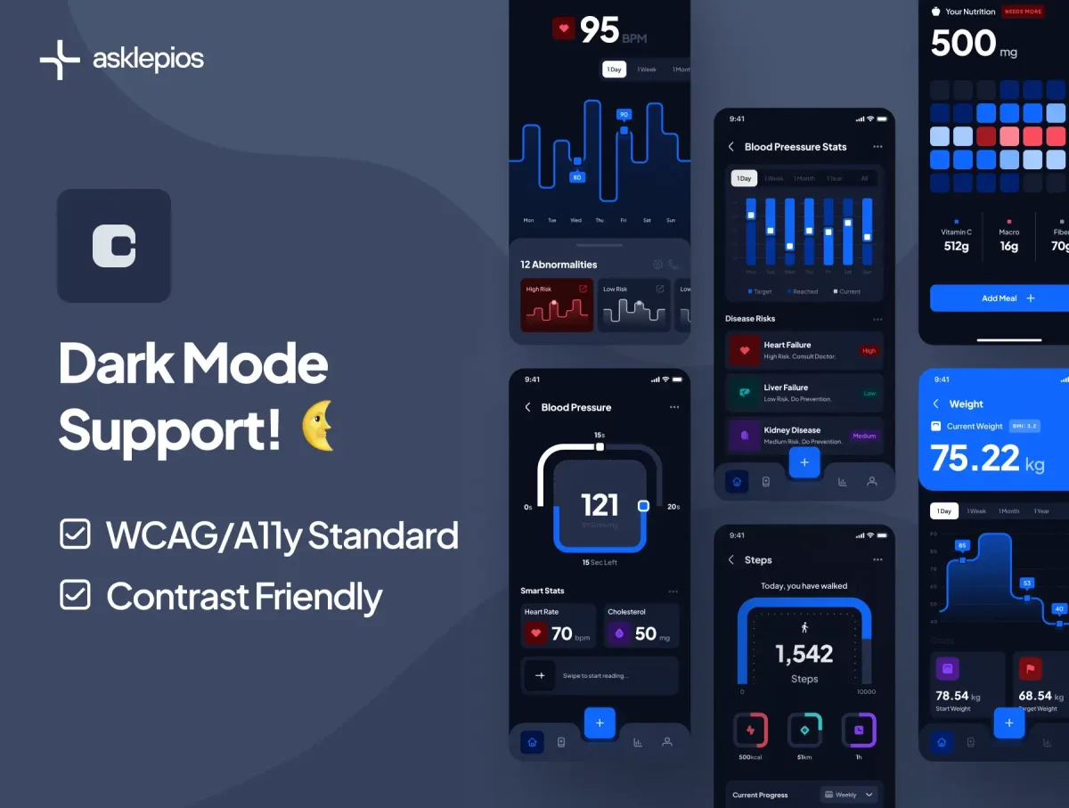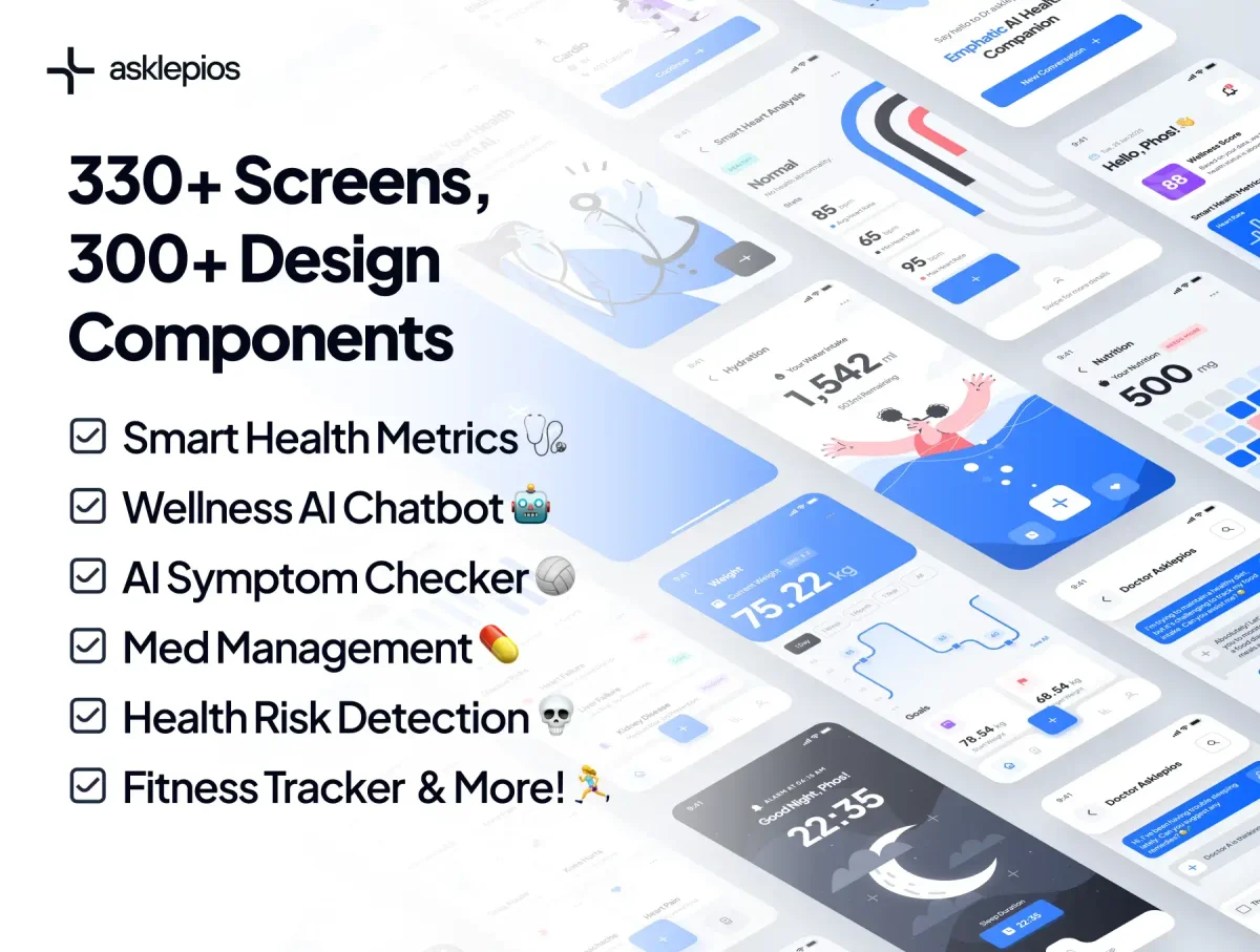 Product Description Inspired by the Greek god of healing, the asklepios UI kit empowers you to create intuitive, data-driven healthcare & wellness user interfaces with an array of smart mobile app features. Our intelligent UI kit unites healthcare and AI technology to create modern personalized care. ✦ Product Highlights ✦ 330+ Screens ✦ 300+ Components ✦ 4x Bonus Dashboard ✦ 55+ Healthcare Illustrations ✦ Dark Mode Support ✦ asklepios Icon Set ✦ asklepios Design System ✦ Holistic Design Principle ✦ Smart Layer (Autolayout) & Semantics ✦ Lifetime Update & Support ✦ Font Included (Jakarta Plus Sans by Tokotype, Google Font License) The asklepios UI Kit is exclusively available on Figma to ensure smooth optimization, updates, and integration for your healthcare & wellness projects.