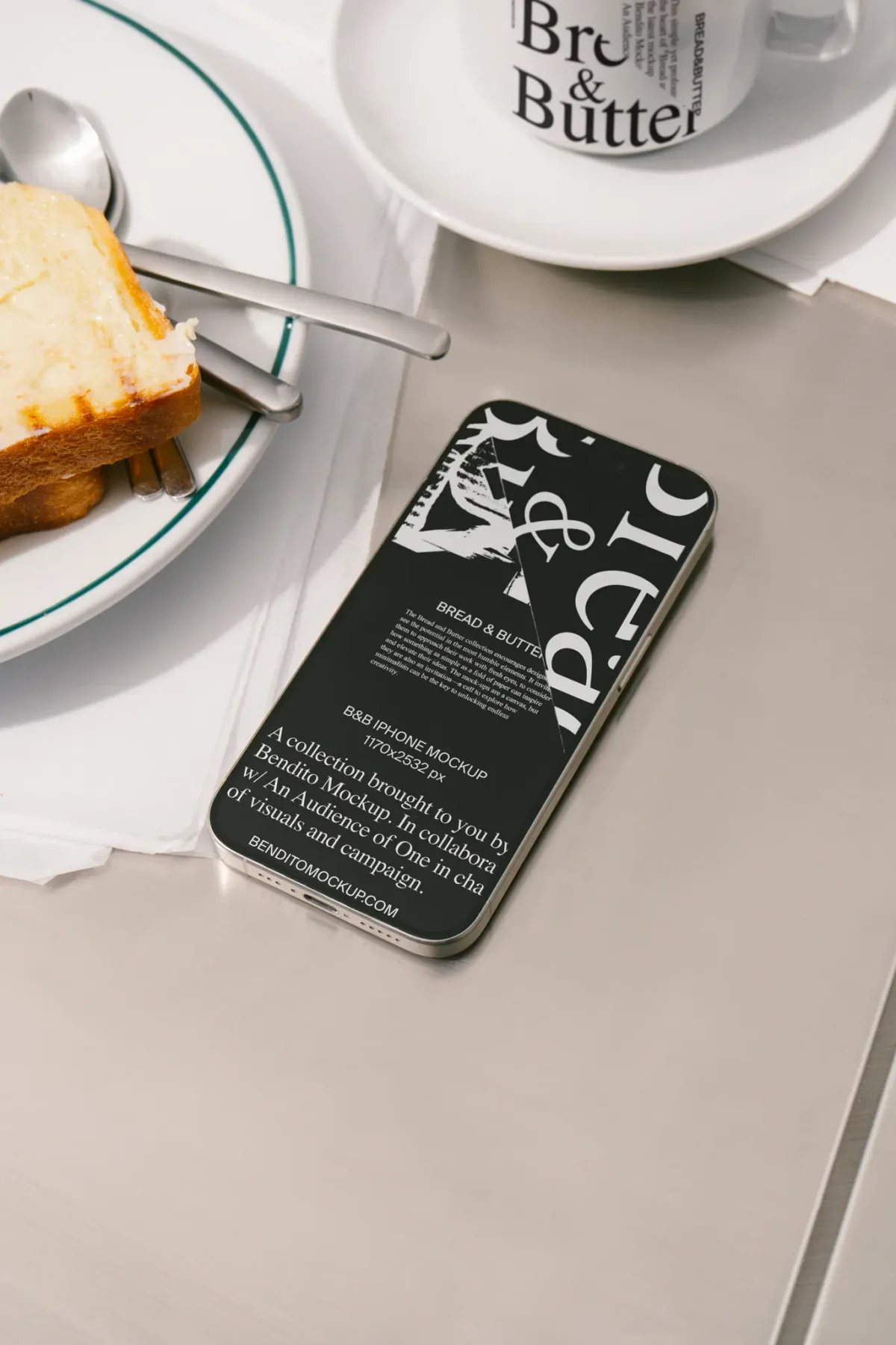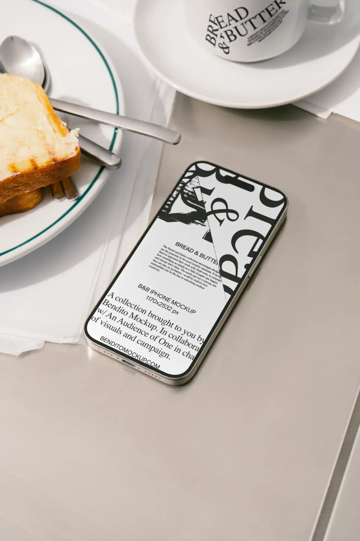 Present your mobile UI with the B&B iPhone Mockup by Bendito Mockup—part of the Bread & Butter series. This high-resolution PSD template features a realistic iPhone on a wooden table, styled with natural lighting, toast, and butter for a cozy, everyday setting. Designed for Photoshop, it includes smart object layers for fast editing, making it ideal for showcasing app interfaces, web designs, or minimalist branding in a lifestyle-inspired scene. Perfect for designers who want to bring warmth and realism to their mockup presentations.