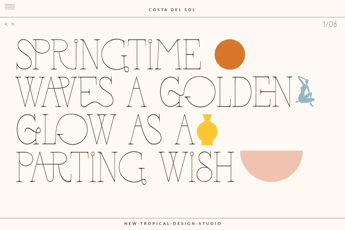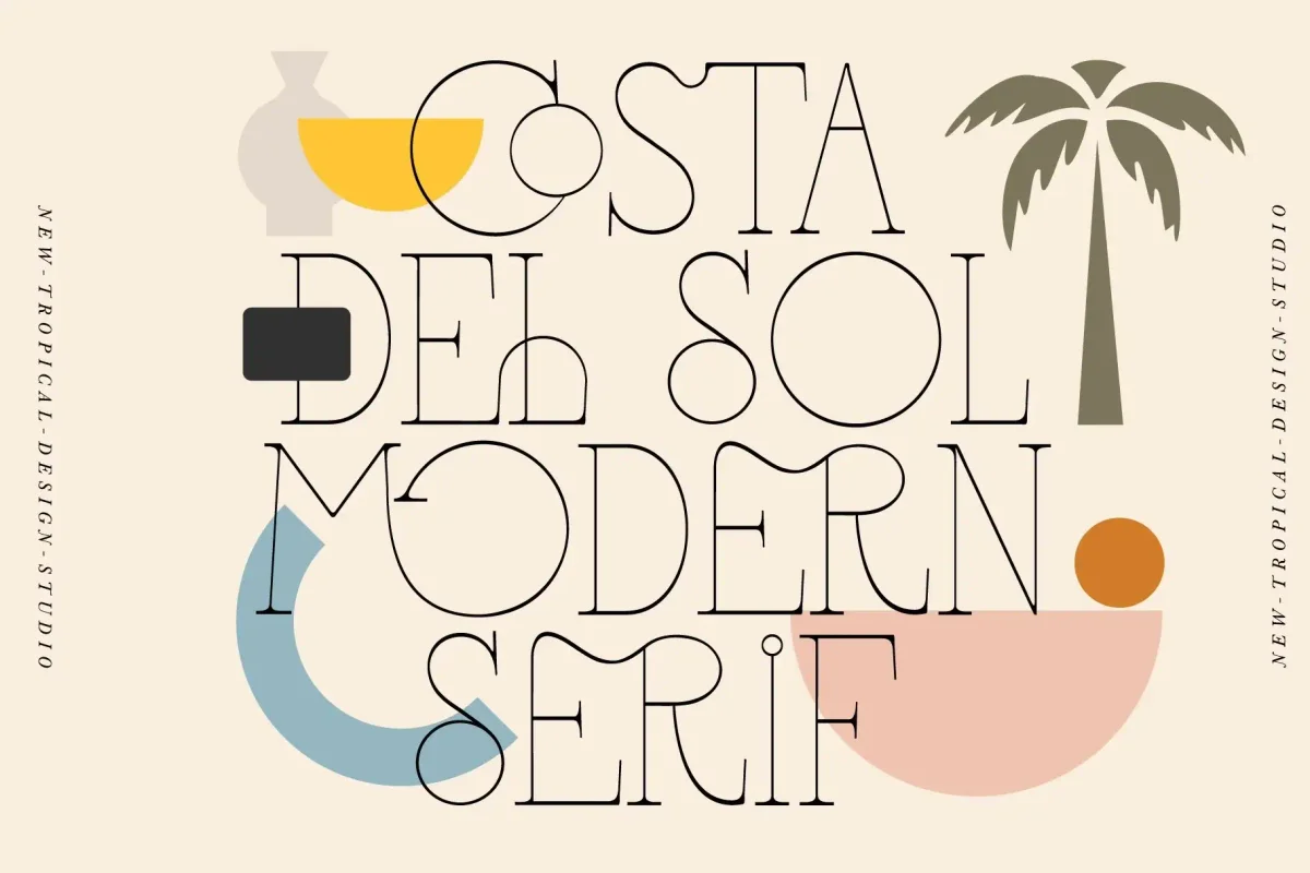 Costa Del Sol is a super fun ligature serif. With over 50 joining ligatures it's easy to make a unique logo, headline or poster in seconds. Full of interesting characters, this memorable typeface has a geometric playful vibe that is a little bit modern and a little bit deco.