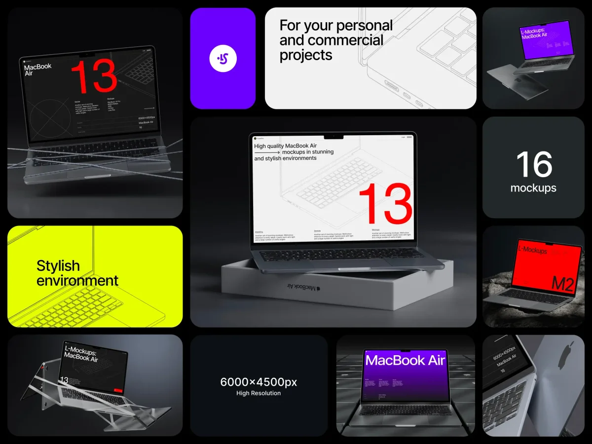 Explore unconventional presentation angles with L-Mockups: MacBook Air. This 16-mockup set (6000×4500 px) showcases the laptop in brutalist interiors, textured surfaces, and abstract props—designed for website UI previews, SaaS dashboards, and creative tech branding. Smart object PSDs compatible with Photoshop, Figma, and Sketch