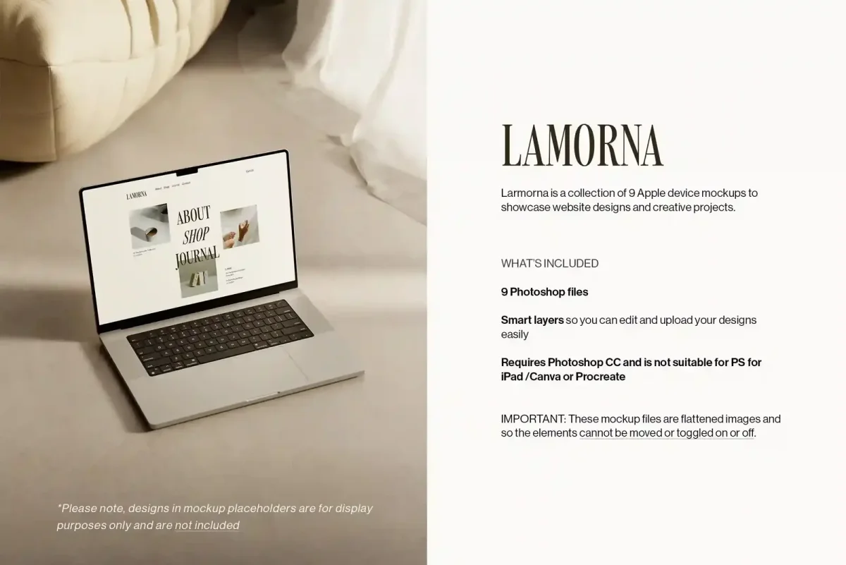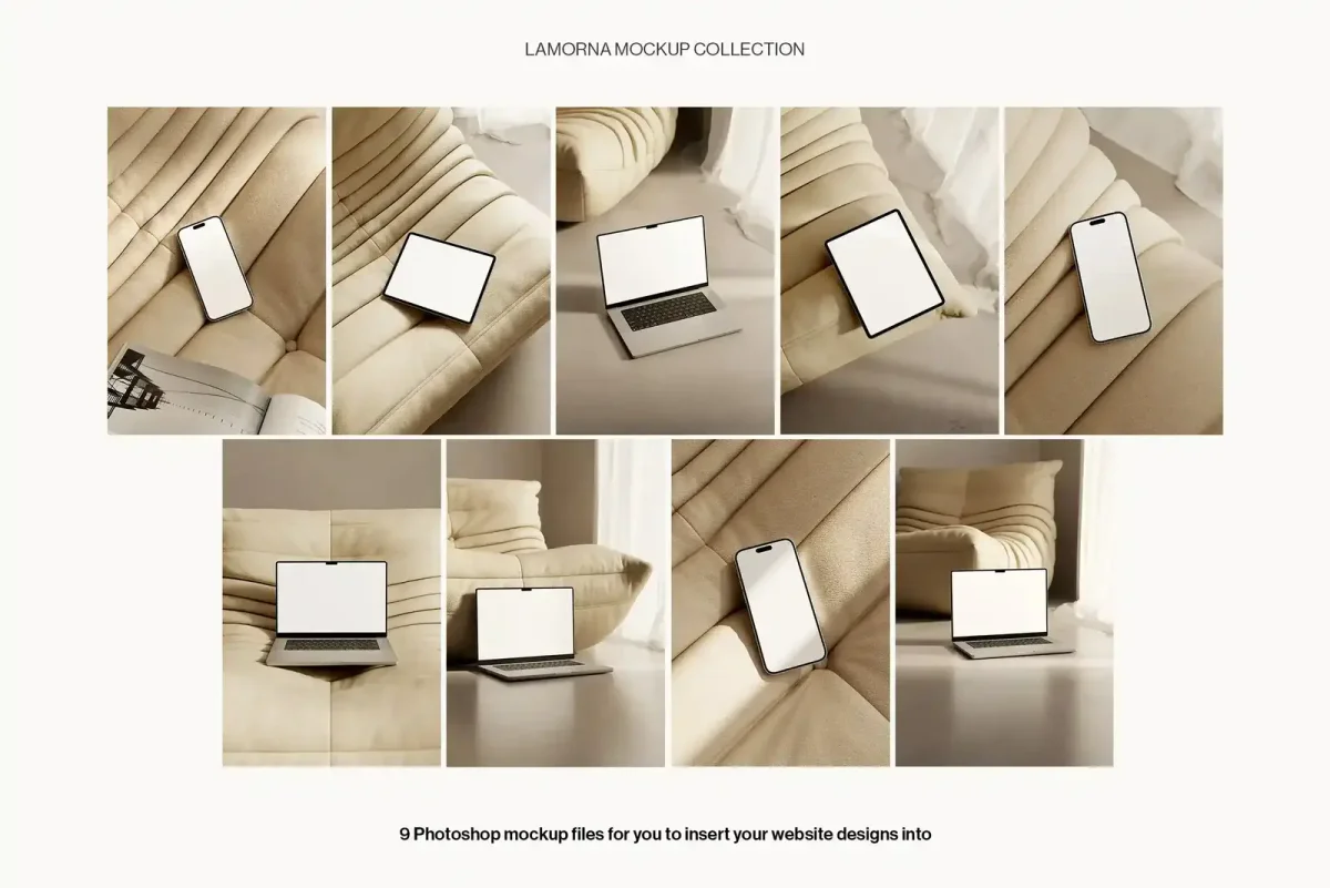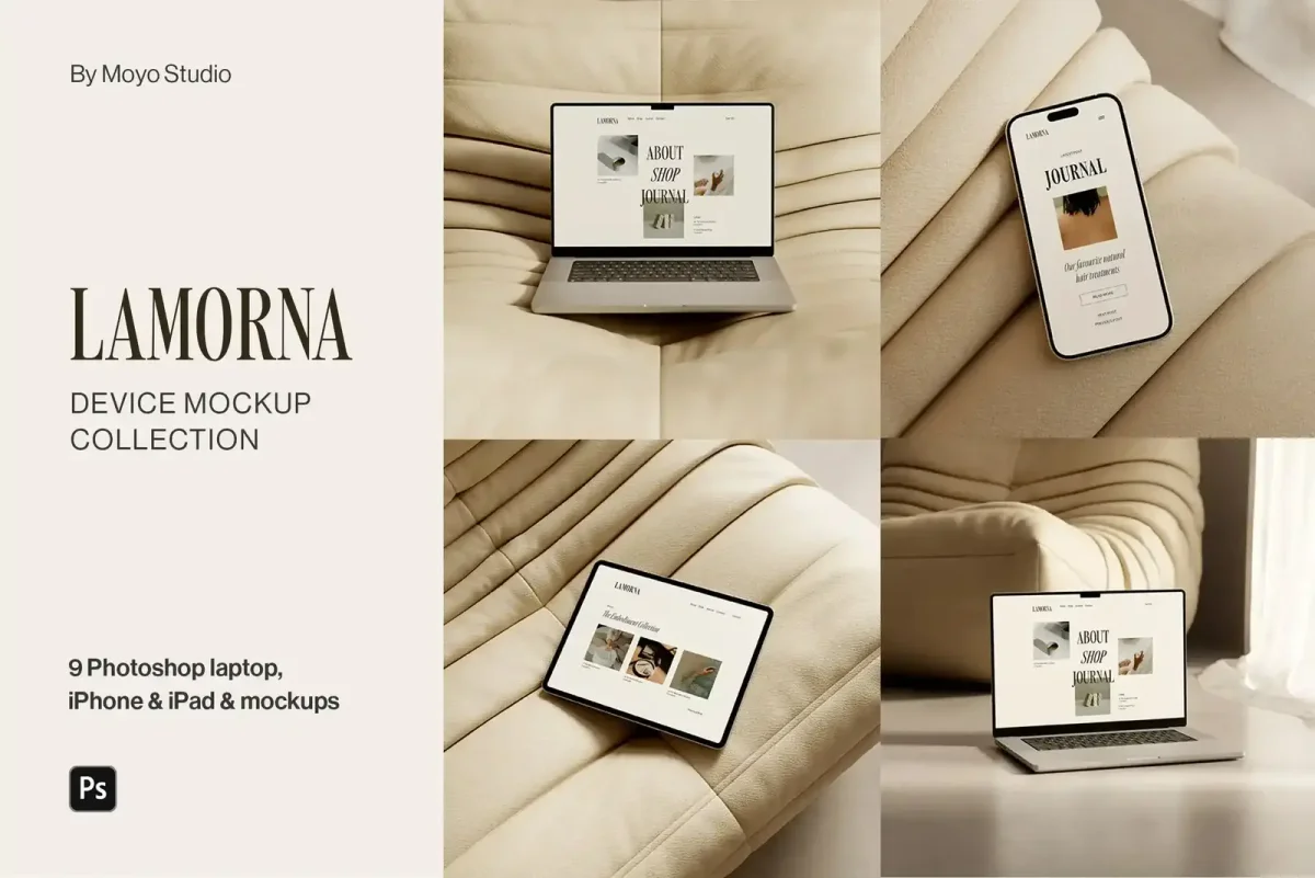🔥 Use our coupon DESIGNPIQ15 to get 15% off at checkout! Present your website and app designs with clarity using the Lamorna Device Mockup Bundle by Moyo Studio. This refined set includes 9 high-resolution PSD mockups—featuring 4 MacBook, 3 iPhone, and 2 iPad scenes—crafted in a clean, natural-light setting for a calm, editorial feel. Each file includes smart object layers for easy drag-and-drop customization in Photoshop, making it ideal for UI/UX designers, freelancers, and brands looking to elevate digital portfolios, social content, or client presentations with cohesive, modern visuals. What’s included: ✦ 4 Macbook laptop mockups ✦ 3 iPhone mockups ✦ 2 iPad mockups