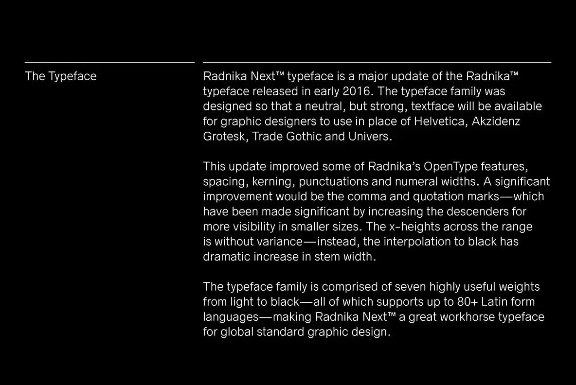 Radnika Next enhances the geometry, kerning, spacing and ligature handling of the Radnika typeface. Radnika Next is a multi-purpose sans serif typeface that bridges the gap between the strong expressive typefaces of the 19th century and the finer, rather stern, typefaces of the 20th century. Radnika Next embodies Hanken's considered approach. The updated font is beautiful yet subtle. This sans serif typeface is perfect in its space: a solid workhorse ready for application anywhere in the world. The font's nearly endless options give it astounding flexibility and appeal. According to Hanken, Radnika was a sans serif font to be used instead of "Helvetica, Akzidenz Grotesk, Trade Gothic, or Univers." In other words, broad use was a major consideration. The resulting Radnika font was effective and beautiful. Now, the spectacular font Radnika Next improves on the original. Per Hanken Design, Radnika Next enhances the geometry, kerning, spacing and ligature handling of Radnika. Like its forerunner, Radnika Next suggests both expressive 19th typefaces of the 19th century and sterner 20th century typefaces. The font is perfectly balanced in this respect. With 18 styles in six weights and extensive language support, Radnika Next has broad appeal. This is a clean, functional typeface for almost any use. It is excellent for mobile, web, branding, corporate communications, art projects, advertising, signage, body text, social media, educational materials, print media. Anywhere a rational, easy to use workhorse is needed.