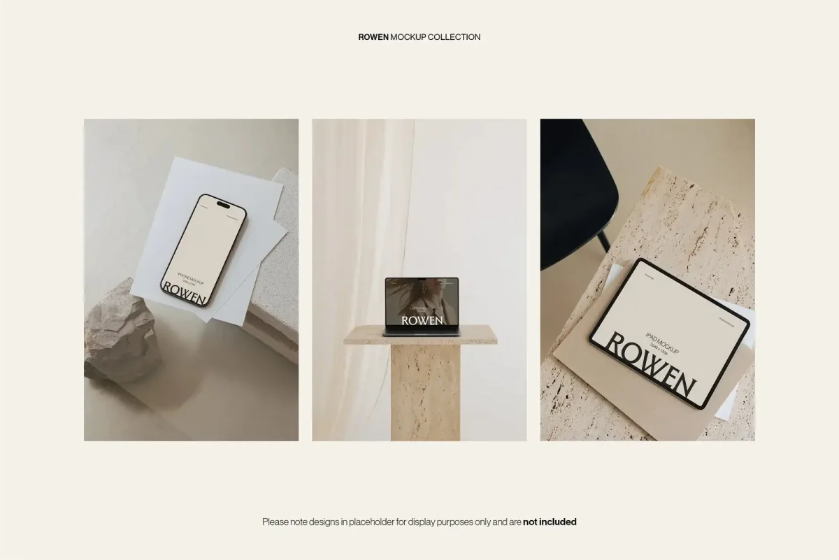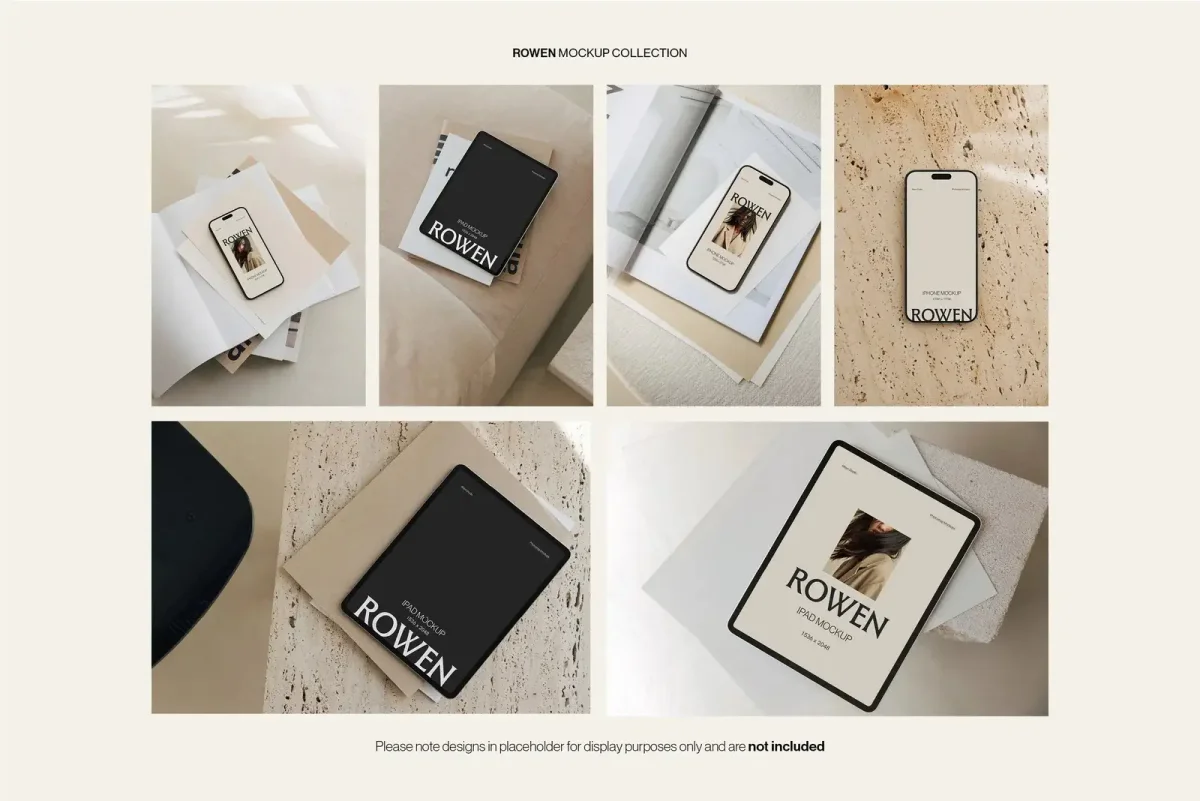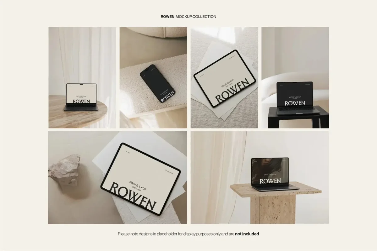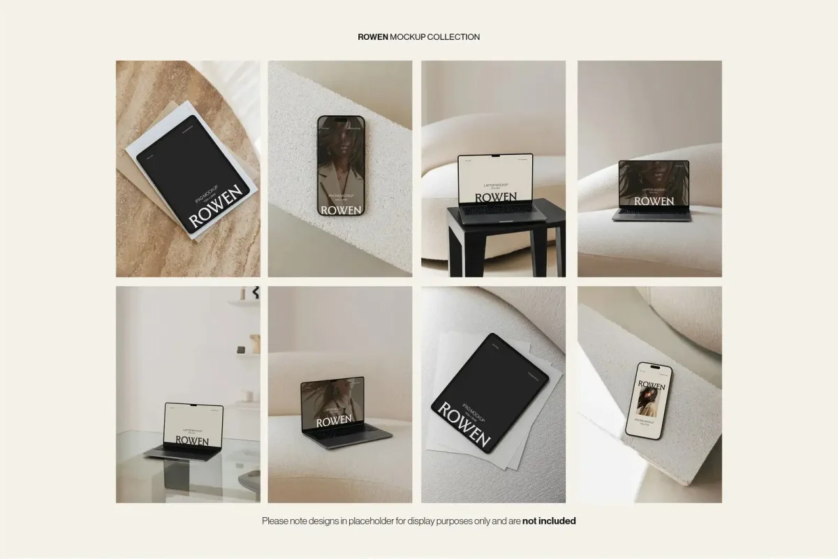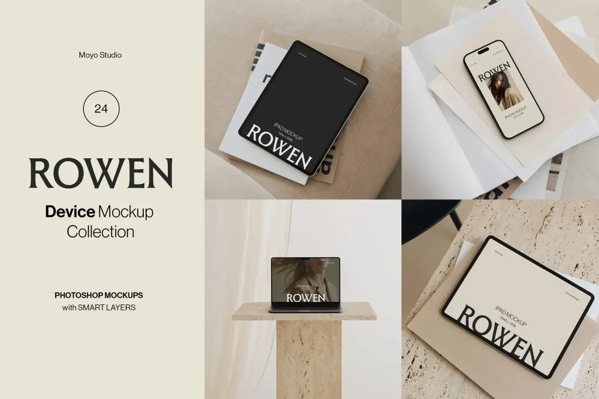 🔥 Use our coupon DESIGNPIQ15 to get 15% off at checkout! Showcase your UI/UX designs, websites, and app interfaces with the Rowen Device Mockup Bundle by Moyo Studio. This set includes 24 high-resolution PSD mockups—featuring 8 MacBook, 8 iPad, and 8 iPhone scenes—ideal for portfolios, client projects, and responsive design presentations. Each Photoshop template features smart object layers, editable backgrounds, toggleable notches, and optional screen reflections. With a clean, modern layout, Rowen is perfect for designers, developers, and creative teams who need professional, presentation-ready mockups. Scenes included: ✦ 8 MacBook ✦ 8 iPad ✦ 8 iPhone