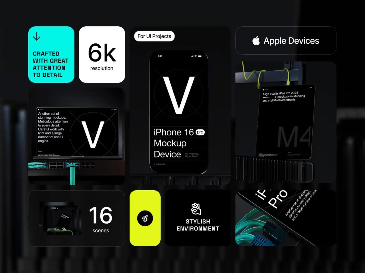 Showcase your designs across platforms with V-Mockups: Apple Devices, a 6K-resolution multi-device mockup kit featuring iPhone 16 Pro, iPad Pro M4, and MacBook in realistic workspace settings. Ideal for UI kits, SaaS dashboards, and responsive layouts. Smart object PSDs compatible with Photoshop, Figma, and Sketch for seamless editing. ✦ Includes iPhone 16 Pro, iPad Pro M4, and other Apple devices ✦ Stylish environments for versatile presentations ✦ Compatible with Photoshop, Figma, and Sketch ✦ Easy-to-use smart object layers for quick customization